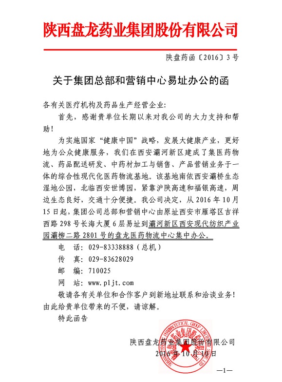 关于新宝gg创造奇迹总部和营销中心易址办公的函日期:2016-10-15