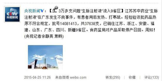 ËÕÖÐÒ©Òµ3Íò“ÉúÂö×¢ÉäÒº”Òò²»Á¼·´Ó¦±»ÕÙ»ØÈÕÆÚ£º2015-04-25